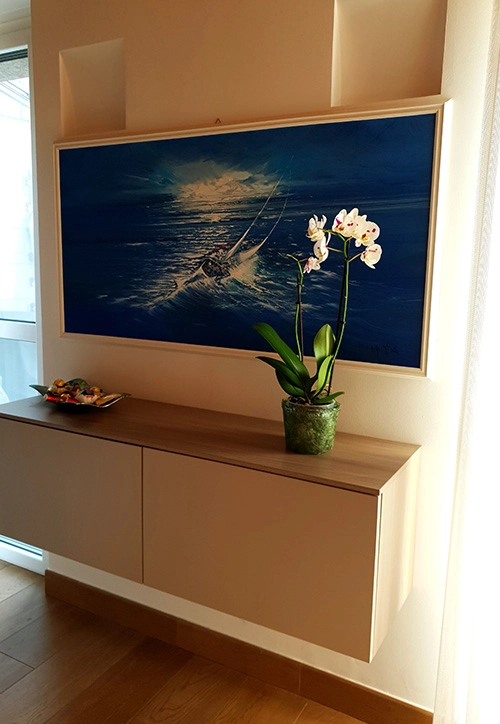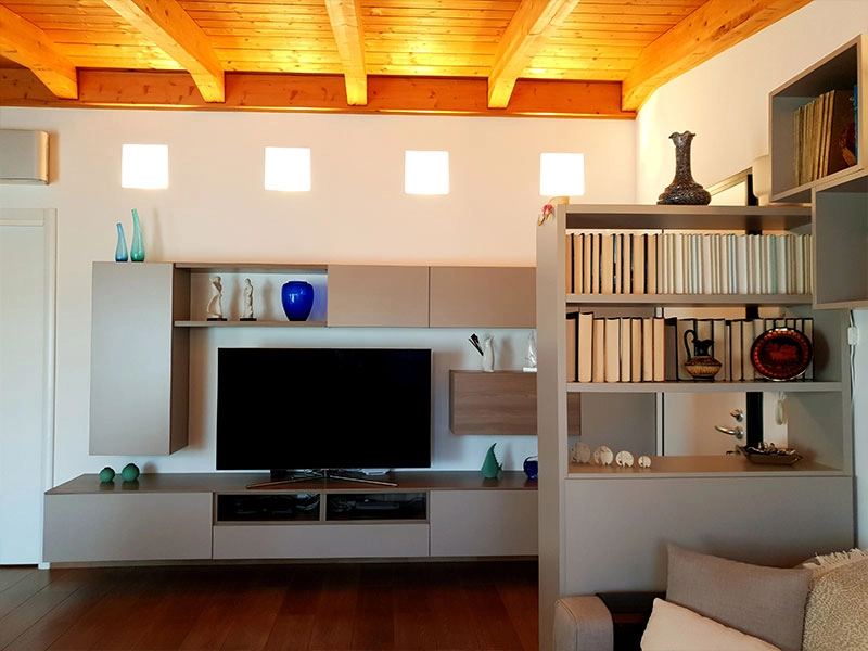 Il living, coordinato con la cucina, segue la stessa palette di colori e materiali, creando un ambiente unico e armonioso. Questa continuità visiva tra le due aree aumenta la percezione di spazio e flusso, rendendo l’intera area abitativa più accogliente e organica.