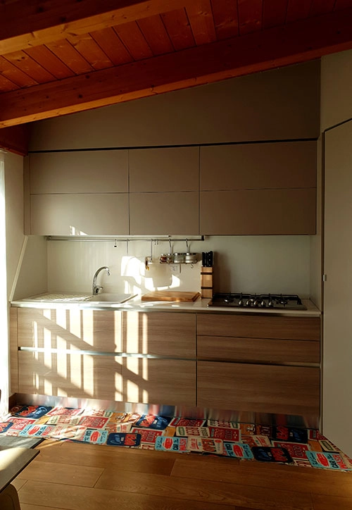 La cucina, con le sue ante tortora e dettagli in legno, offre un mix di calore e modernità. Il top in quarzo lucido è abbinato allo schienale base pensile, estremamente pratico, resistente e facile da pulire, ideale per l’uso quotidiano.