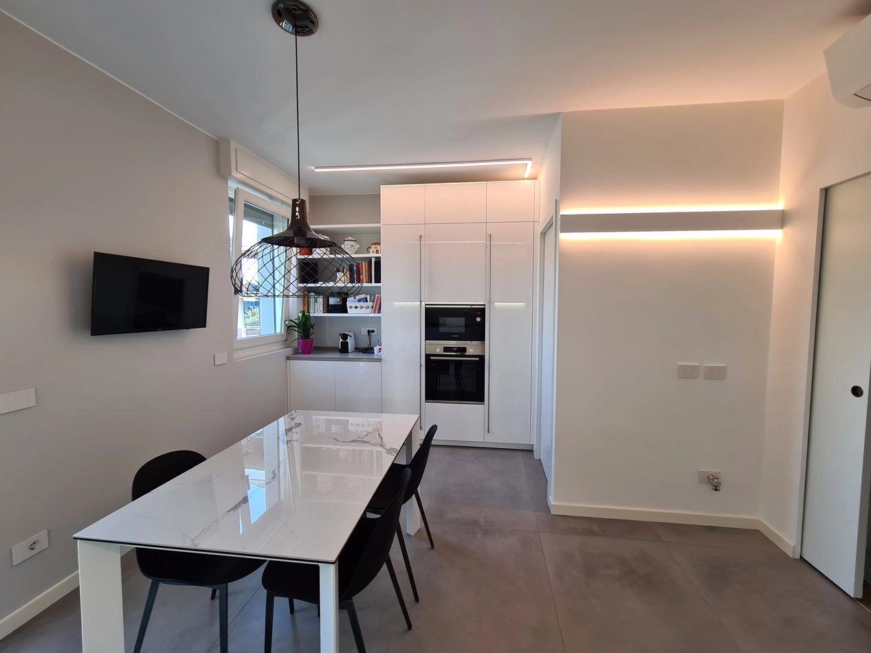 Noi di Planet Cucina non ci accontentiamo di fornire una cucina con una laccatura realizzata con cura. Per questo progetto abbiamo eseguito una verniciatura di colore bianco per esaltare la luminosità dell’ambiente con l’effetto lucido. Abbiamo inoltre aggiunto un pannello luminoso Magnetolab, che da come si intuisce dal nome, oltre a fornire la luce giusta per la cucina, essendo magnetico, permette di attaccare degli accessori. Sempre per dare spazio agli accessori abbiamo fornito la cucina dell’Accessorio Vertical tra base e pensile in inox personalizzabile. Le colonne che compongono la cucina sono rese molto funzionali grazie a comodi maniglioni per l’apertura.