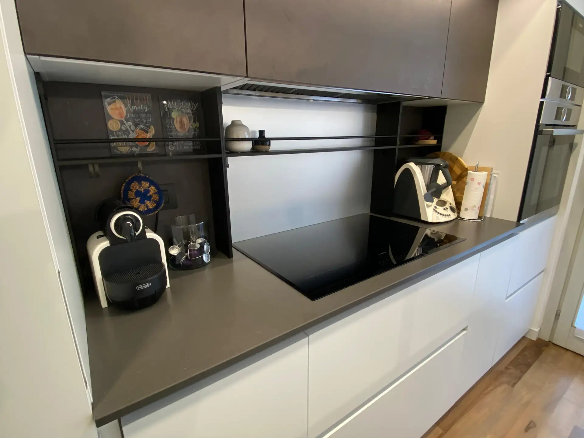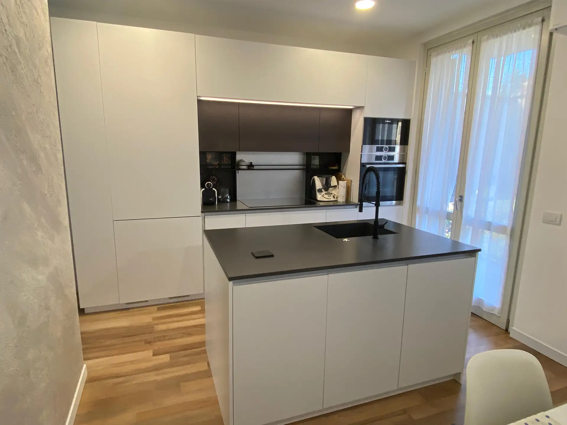 Gli elementi verticali neri, sapientemente inseriti tra la base e il pensile, sono una soluzione intelligente per sfruttare al meglio lo spazio verticale e aggiungono un dinamismo visivo all’insieme, creando un piacevole gioco di contrasti.
