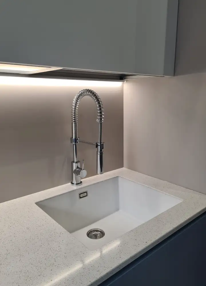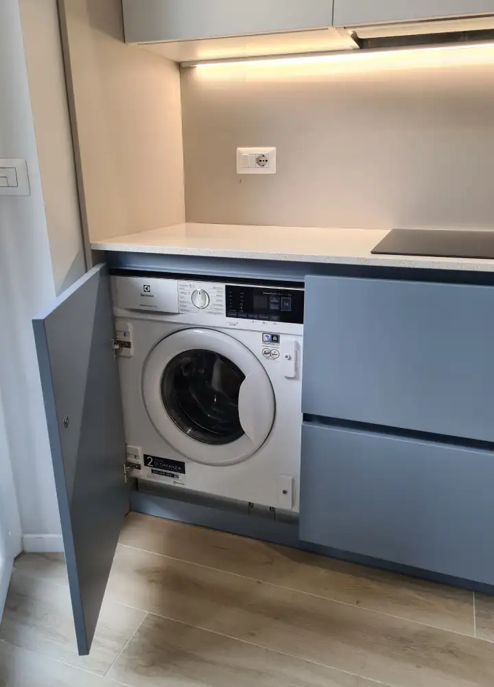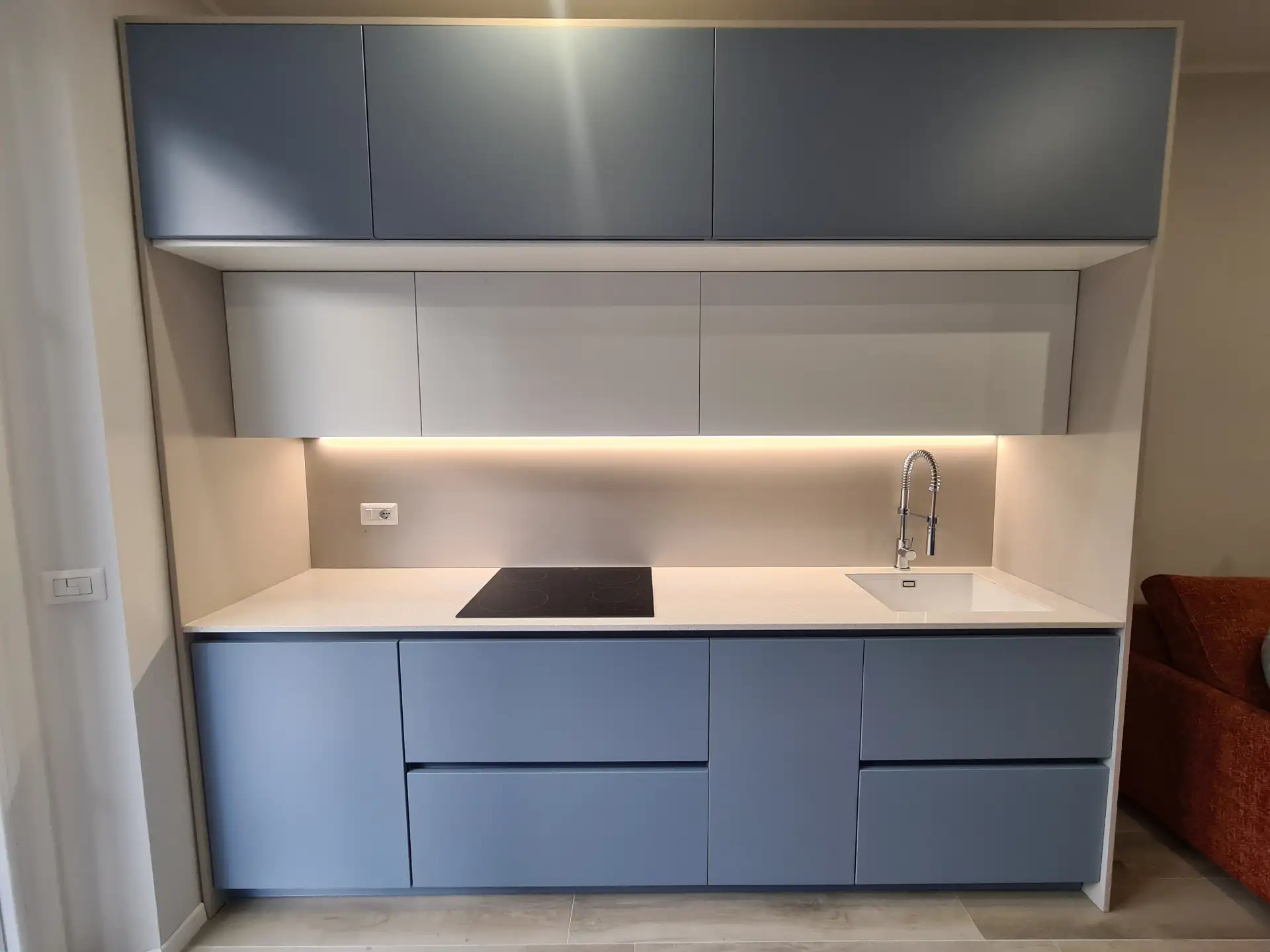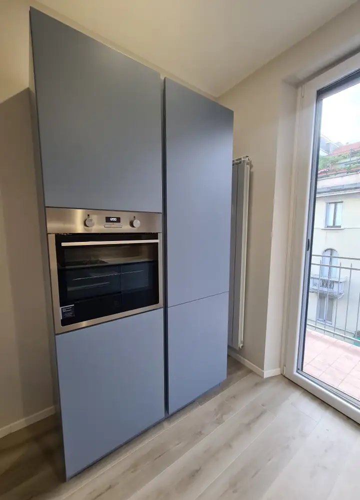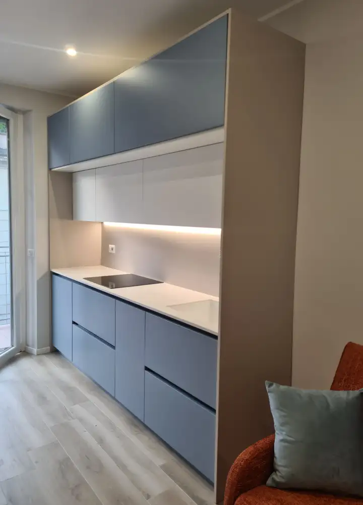 In uno spazio ristretto abbiamo progettato una cucina a vista laccata blu avio, con top in quarzo bianco, piano a induzione e lavello bianco integrato. Abbiamo incorniciato la cucina con dei pannelli in modo da creare una cornice e creare una separazione con il divano. Dato lo spazio limitato, una doppia fila di pensili risponde all’esigenza di avere più vani contenitivi. La fila inferiore di pensili risulta leggera e luminosa grazie alla tinta bianca, come il piano, le pareti e la cornice.Elettrodomestici a scomparsa