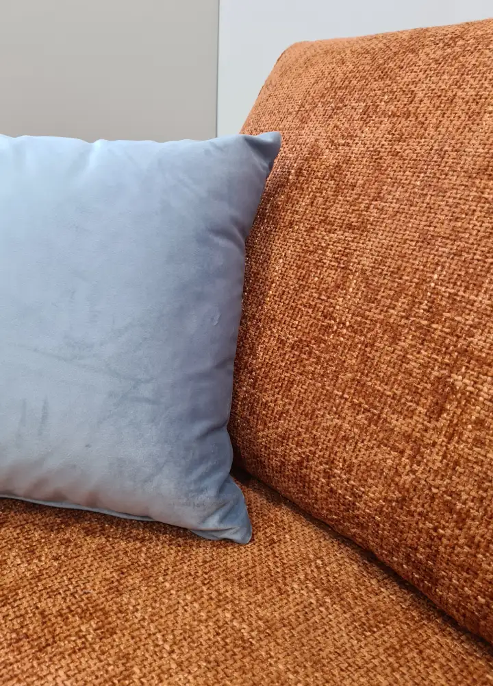 Tutti i dettagli, anche i più piccoli, vengono studiati insieme al cliente e niente viene lasciato al caso, come per esempio i cuscini del divano che riprendono la tinta della cucina per dare continuità all’ambiente.